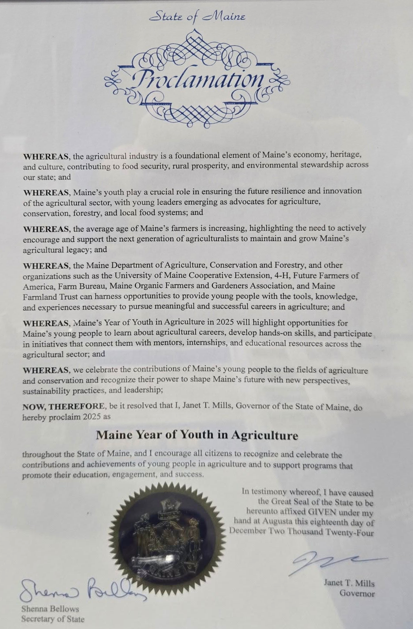 Maine’s Year of Youth in Agriculture in 2025 will highlight opportunities for Maine’s young people to learn about agricultural careers, develop hands-on skills, and participate in initiatives that connect them with mentors, internships, and educational resources across the agricultural sector; and celebrate the contributions of Maine’s young people to the fields of agriculture and conservation and recognize their power to shape Maine’s future with new perspectives, sustainability practices, and leadership!